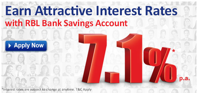| | | |  |  | | | | | | | | | | Here are some incredible benefits of banking with RBL Bank | | | | | |  | | Attractive Interest Rates | | |  | | Safe Deposit Lockers** | | |  | | Anytime / Anywhere banking | | | |  | | Unlimited and Free ATM withdrawals in India | | |  | | Simple and uniform service charges | | | | | | | | | | | | | | | | | | | *RBL Bank offers savings account interest rates @ 7.10% p.a. on balances > Rs. 1 Cr upto Rs. 5 Cr ; 6.50% p.a. on balances > Rs. 10 Lac upto Rs. 1 Cr ; 6.00 % p.a. on balances > Rs. 1 Lac upto Rs. 10 Lac ; and 5.50 % p.a. on balances upto Rs. 1 Lac on a daily balance basis. For balances above Rs. 5 Cr, please get in touch with your Relationship Manager / Branch Manager. These rates will apply on the entire balances above Rs. 1 Lac, as per the above slabs and the initial Rs. 1 Lac balance will earn interest at the rate of 5.50 % p.a. **Subject to availability | | | | | | |  | | | | | |